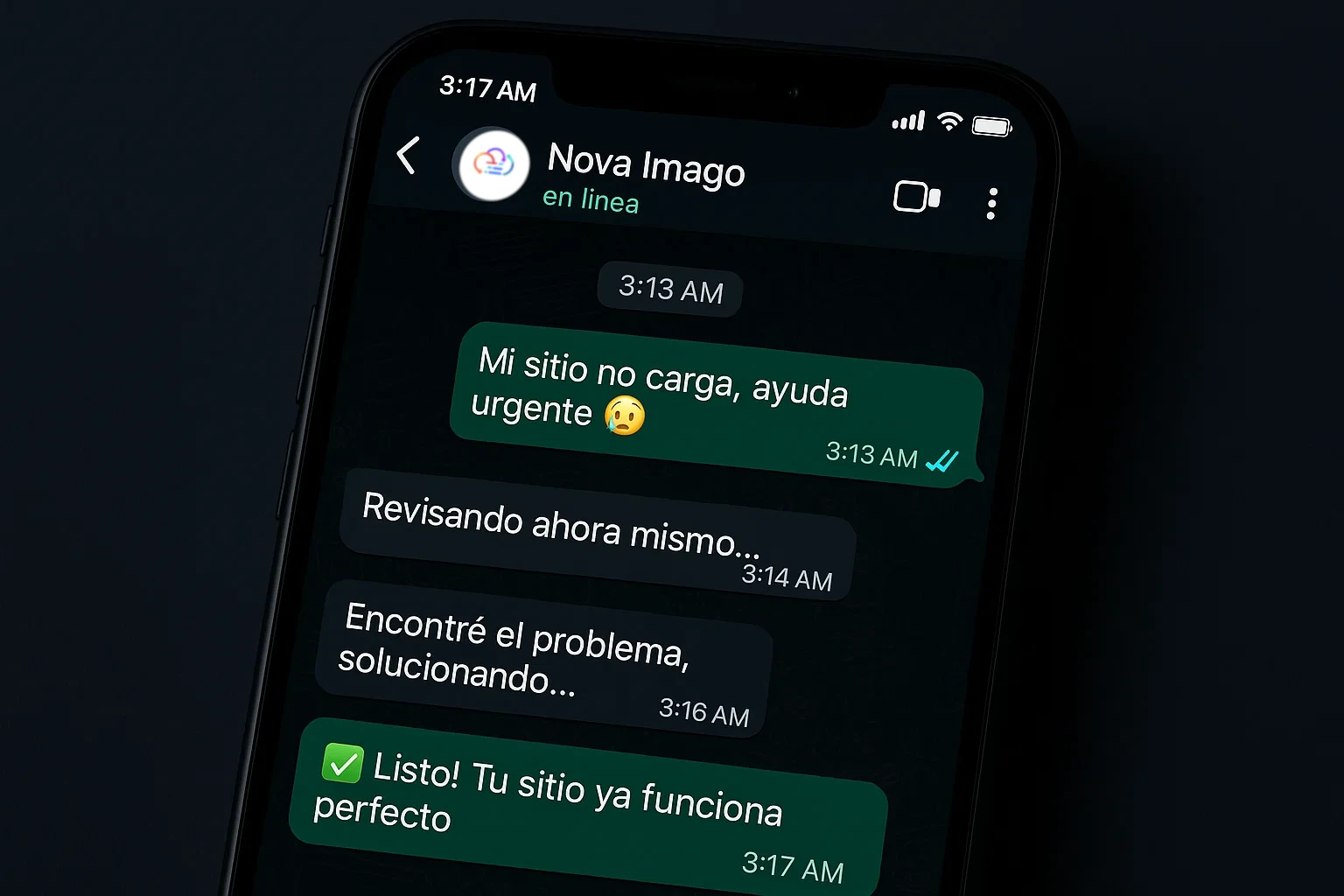 Tu sitio funciona perfecto a las 3AM de un domingo. Pero si algo pasa, nuestro equipo experto responde en minutos vía WhatsApp , no en días por email.